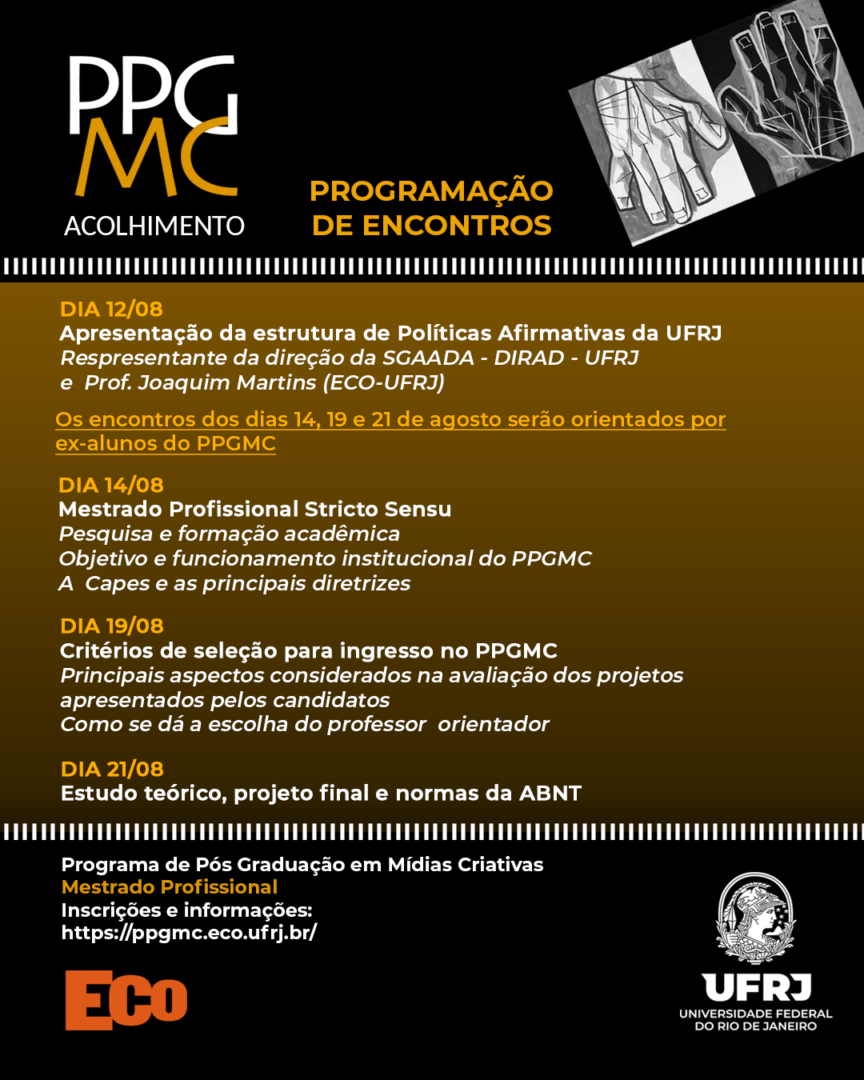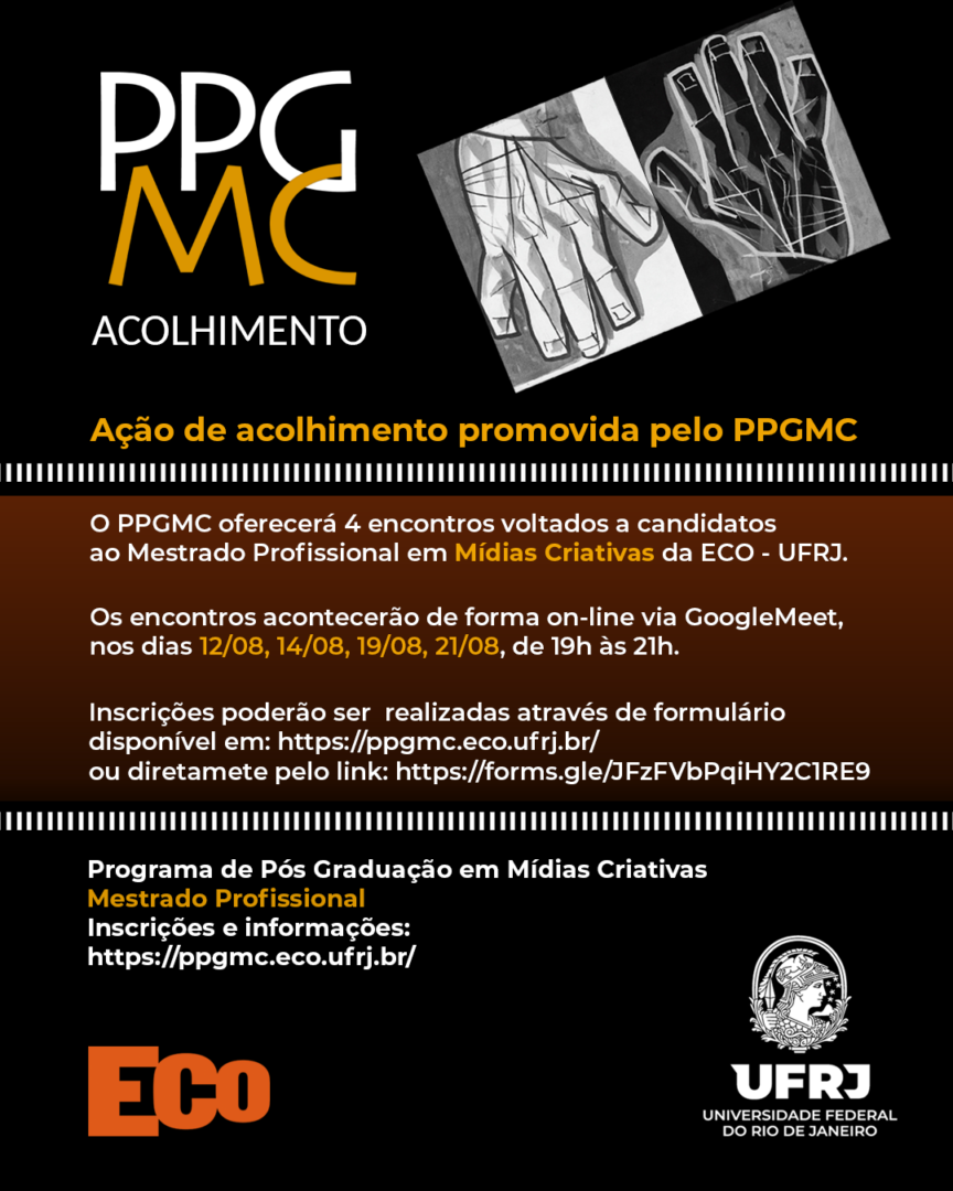 O PPGMC, Programa de Pós-Graduação em Mídias Criativas da Escola de Comunicação da UFRJ convida especialistas para abordar esses assuntos em um Encontro que ocorrerá nos dias 13 e 14 de novembro, de forma presencial e gratuita, a partir das 16h, no Auditório da CPM, localizado no Campus Praia Vermelha da UFRJ.